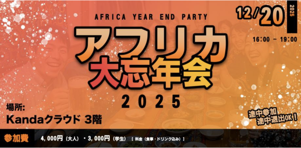 アフリカクエスト主催、A-GOAL共催で、2025年の締めくくりとして、忘年会を開催します!