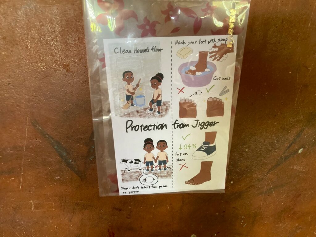 ② 靴の提供:再感染を防ぐため、治療後に参加くださった方々に靴を提供します。提供前には「靴の正しい使い方」についてのレクチャーも行い、日常的に履き続けることの重要性を伝えます。